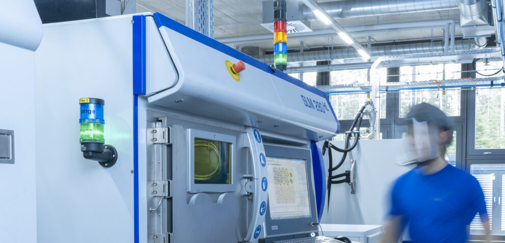 Der 3D-Druck in Metall funktioniert bei uns durch Selektives Laserschmelzen (Engl. selective lasermelting) oder kurz SLM. Anders als bei herkömmlichen Schweißverfahren, wird hier ein Laser als Wärmequelle verwendet. Der Schweißprozess läuft zur Stabilisierung unter Vakuum ab.